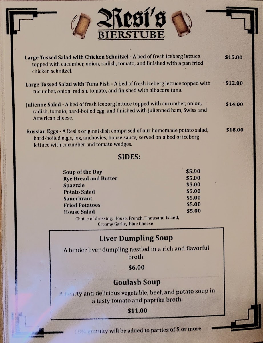 As you come to Resi's Bierstube, prepare for a genuine taste of Germany, wrapped in a friendly neighborhood vibe. Whether you're enjoying a casual meal or celebrating a special occasion, the harmony of flavors and inviting atmosphere will undoubtedly make for an unforgettable dining experience.
